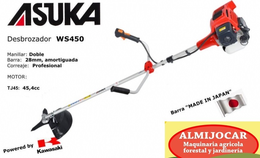 DESBROZADORA CON MOTOR KAWASAKI TJ45 DE 45,4CC, MANILLAR DOBLE, BARRA AMORTIGUADA DE 28mm Y CORREAJE PROFESIONAL