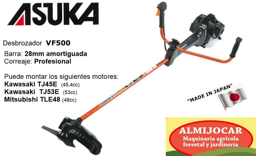 DESBROZADORA CON MOTOR KAWASAKI TJ45 DE 45,4CC, MANILLAR DOBLE, BARRA AMORTIGUADA PROFESIONAL CADENADA DE 28mm Y CORREAJE PROFESIONAL